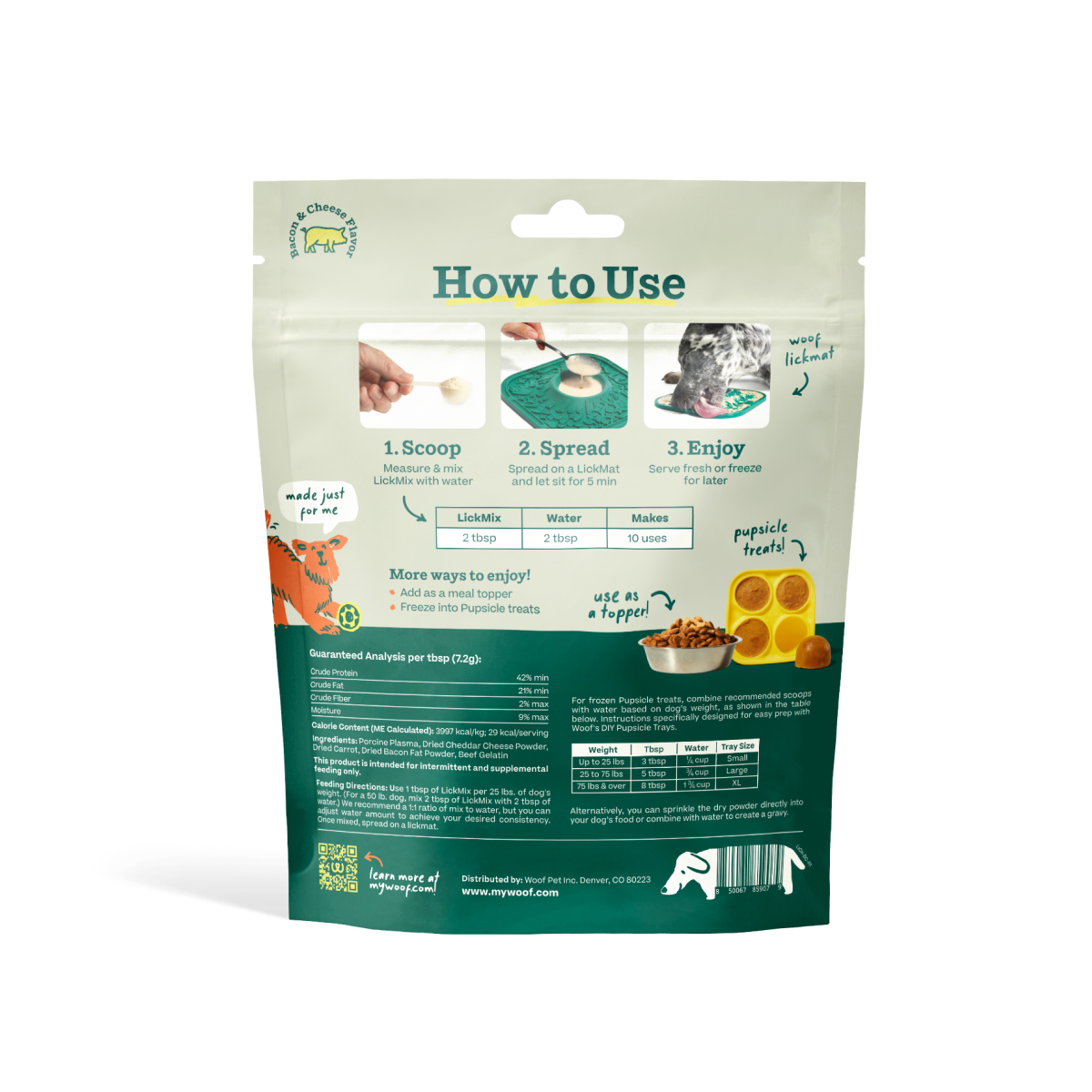 Simply mix the powder in the LickMat's central mixing bowl, spread the mixture on the mat, and in 10-15 minutes you'll have a delicious distraction for your dog.